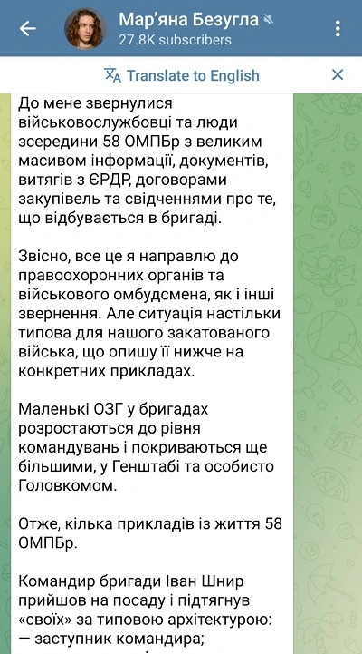 In a scathing post released on April 23th 2026 on her official Telegram channel, Ukrainian MP Mariana Bezugla has levelled explosive allegations against the leadership of the 58th Motorised Rifle Brigade. Describing a “typical” yet “tormented” state within parts of the army, Bezugla’s report paints a grim picture of systemic extortion, physical abuse, and high-level corruption reaching as far as the General Staff.