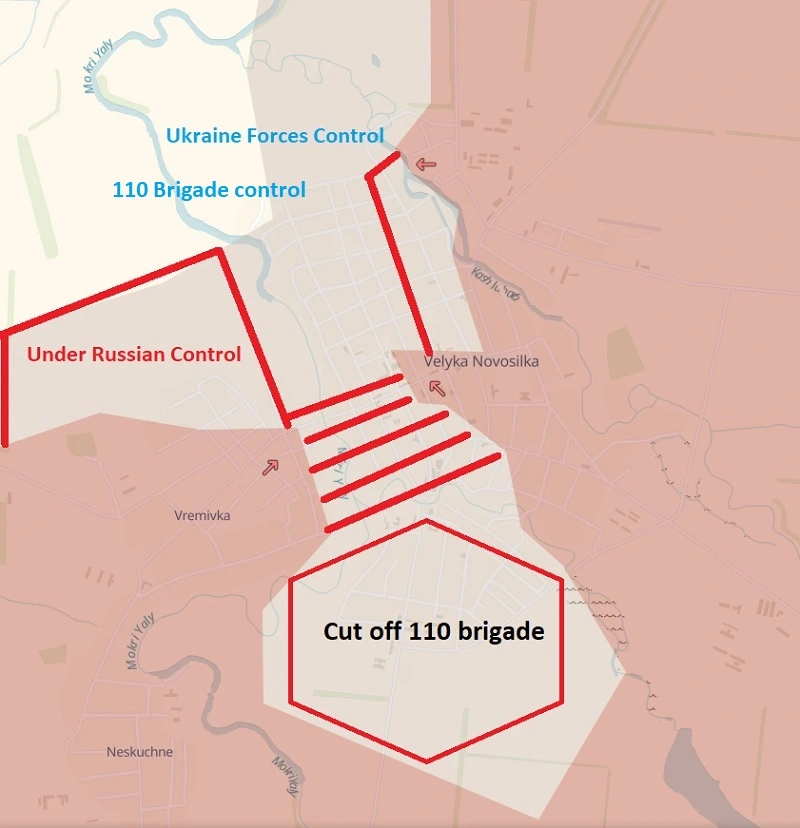 The ongoing battle for Velikaya Novosyolka has reached a perilous stage as Russian troops have established full control over the town’s center, pushing further into the northern part and completely cutting off about 1,500 soldiers of Ukraine’s 110th Brigade in the southern part without any possibility of retreat. The Mokri Yaly, Vovca and Shaitanka Rivers now serves as a formidable barrier to Ukrainian forces, complicating efforts to supply troops and evacuate wounded soldiers. The absence of bridges has exacerbated the logistical nightmare, leaving the Ukrainian troops stranded and vulnerable.